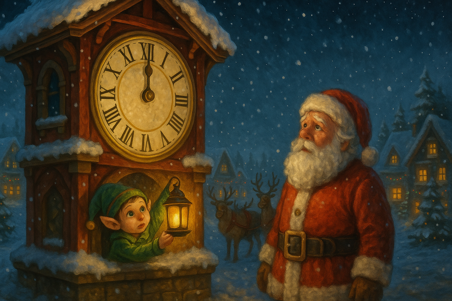 Mancavano solo dieci minuti alla mezzanotte quando la lancetta dei minuti smise di muoversi. Un silenzio improvviso calò sul villaggio. Le renne si guardarono tra loro perplesse, gli elfi si fermarono con i pacchi in mano, e Babbo Natale sospirò guardando il grande quadrante coperto di brina.