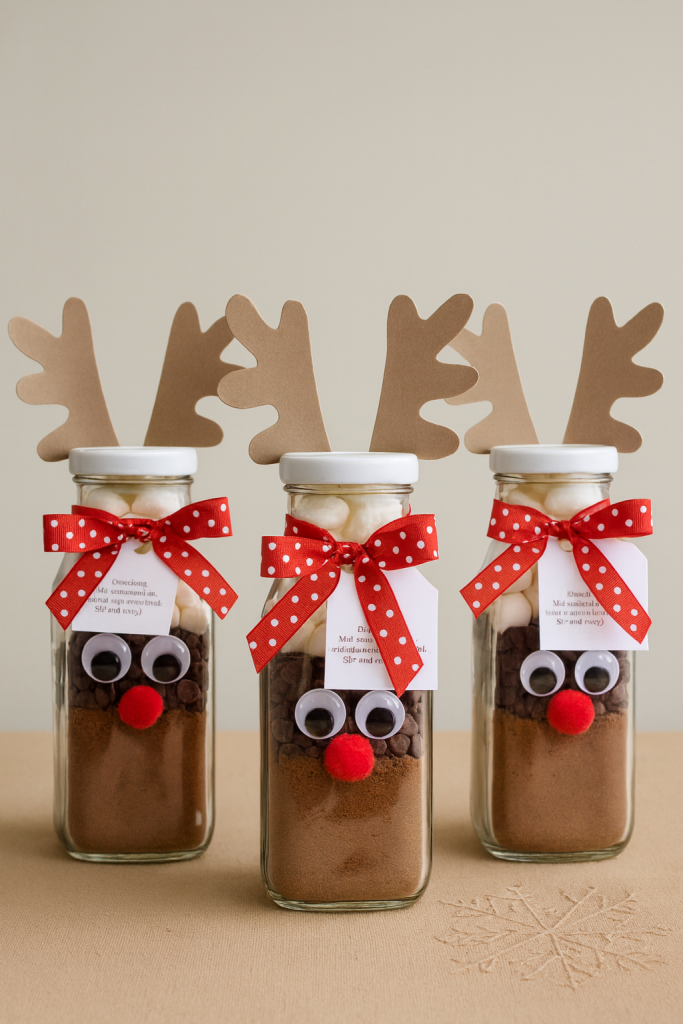 Cosa c’è di più buono di una cioccolata calda da gustare con le luci accese del nostro albero, mentre guardiamo un film natalizio? Realizzare un dono natalizio fatto in casa come queste deliziose bottigliette “renna” è un’idea creativa, economica e perfetta per trasmettere calore e affetto durante le feste. Il risultato è un piccolo regalo goloso e decorativo, ideale per amici, colleghi o maestre, che unisce la magia del Natale al piacere di una cioccolata calda fatta in casa.