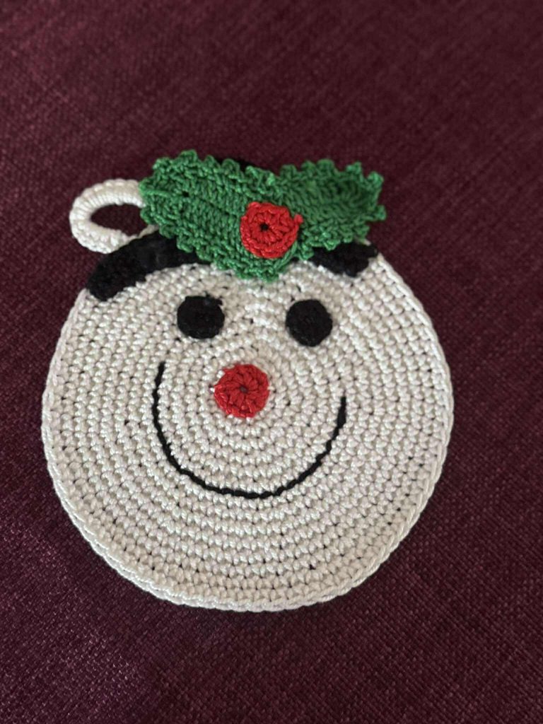 Questa simpatica presina, realizzata con pochi fili di cotone colorato, rappresenta il volto sorridente di un pupazzo di neve, completo di cappello verde con visiera e una piccola bacca rossa, occhietti neri e un naso rosso che spicca sul fondo bianco. Un accessorio che porta subito allegria e spirito natalizio in ogni angolo della casa. Su Natalend come sempre, idee per tutti! Per regali che sanno di casa e di amore, ma anche per addobbare le proprie case, con la passione per il Natale e con qualcosa che possiamo realizzare a mano, se sappiamo usare le basi dell’arte dell’uncinetto!